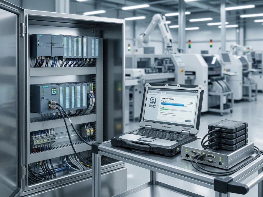 - The process of backing up PCs and PLCs using machine-specific copying tools and programming cables.