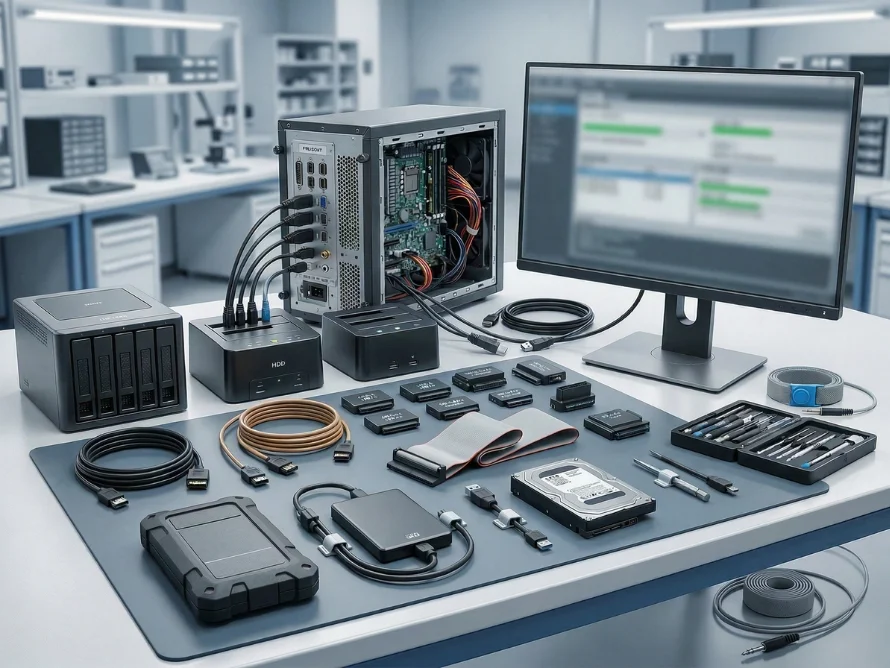 - Professional equipment such as HDD Dock units, SATA/IDE cable kits, and licensed backup software (Acronis, Norton Ghost, etc.) are utilized.