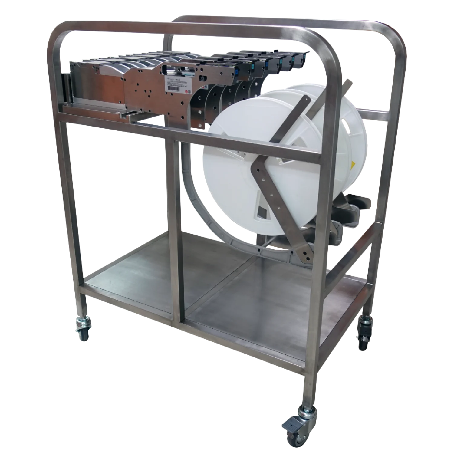 Equipped with four mobile wheels, the AFS-120 can be easily moved and set up in any production environment. The bottom storage space provides convenient organization for accessories such as carrier tapes.