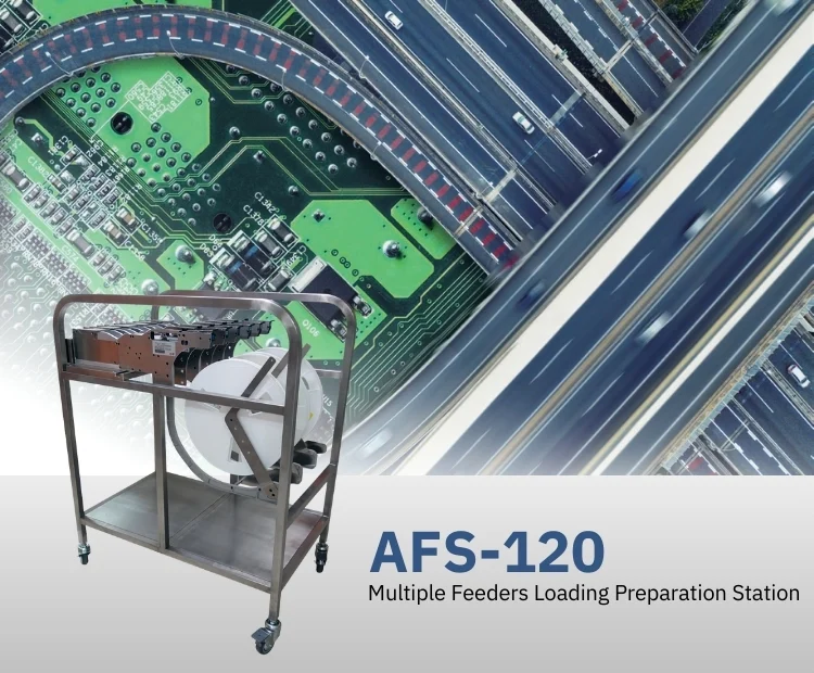 The AFS-120 Multiple Feeder Loading Preparation Station from DediProg is designed for tape input operations, offering compatibility with electrical tape feeders ranging from 8mm to 44mm. With a maximum capacity of six powered slots, each feeder operates reliably with full connectivity.