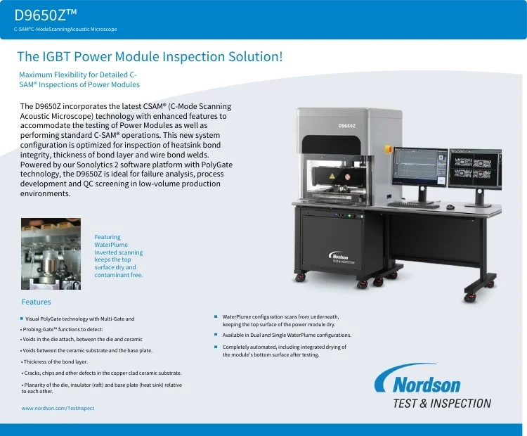 The D9650Z integrates the latest C-SAM technology and includes advanced capabilities to support Power Module testing alongside standard C-SAM applications. This system configuration is specifically optimized for inspecting heatsink bond integrity, measuring bond layer thickness, and evaluating wire bond welds.