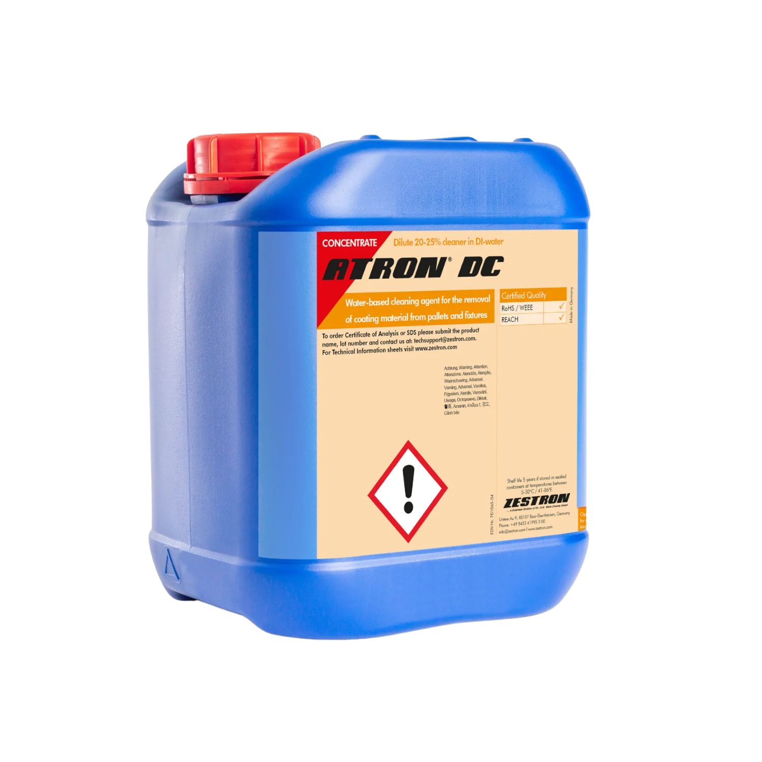 ATRON DC is the world’s first water-based cleaning agent developed to deliver maximum decoating performance while maintaining the highest level of operator safety. It effectively removes various coating materials from coating frames, pallets, and fixtures.