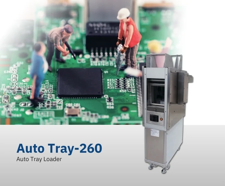 The Auto Tray-260 Adjustable Tray Loader is the first flexible tray loader designed to integrate with DP automated handlers. Unlike the Auto Tray-250, it not only provides a 2-in-1 tray in & tray out function but also supports over 20 types of nonstandard trays. It covers tray dimensions from 120 to 154 mm in width and 300 to 323 mm in length. With the ability to load up to 25 trays simultaneously, the Auto Tray-260 ensures greater efficiency and productivity in automated production lines.