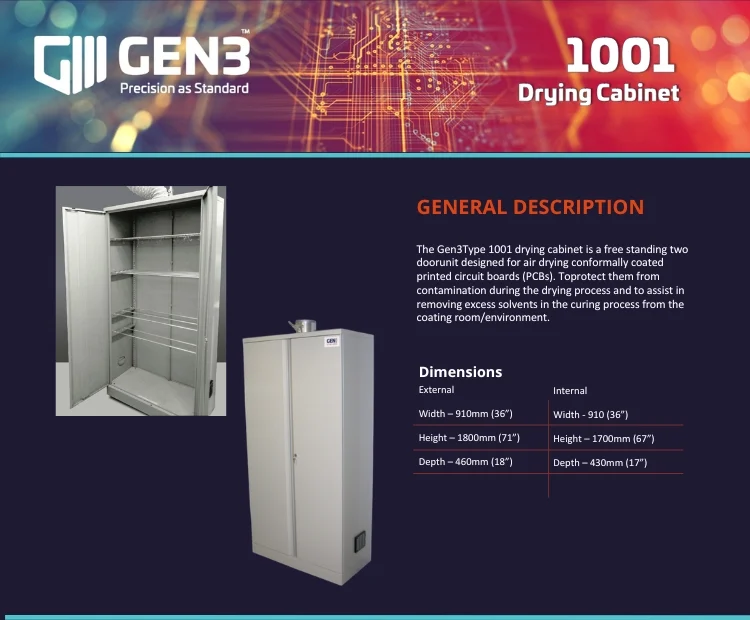 The GEN3 Type 1001 Drying Cabinet is a freestanding, two-door unit designed specifically for the air-drying of conformally coated printed circuit boards (PCBs). The cabinet supports protection of the wet coating film from contamination during drying and assists with the safe evacuation of solvent during the curing process and from the coating room environment.