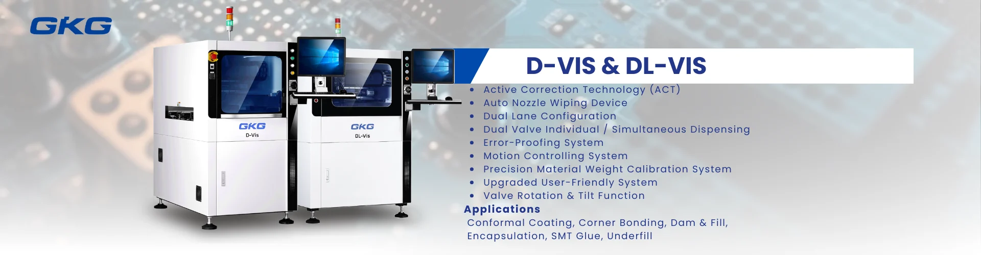 The D Series Machine features precise volume control and positional accuracy, enabling it to dispense discrete dots with ease. It can apply in tight spaces or close to components in ultra-thin lines without crossing boundaries. By using non-contact dispensing technology, it completely eliminates issues commonly found in traditional dispensers.