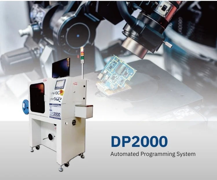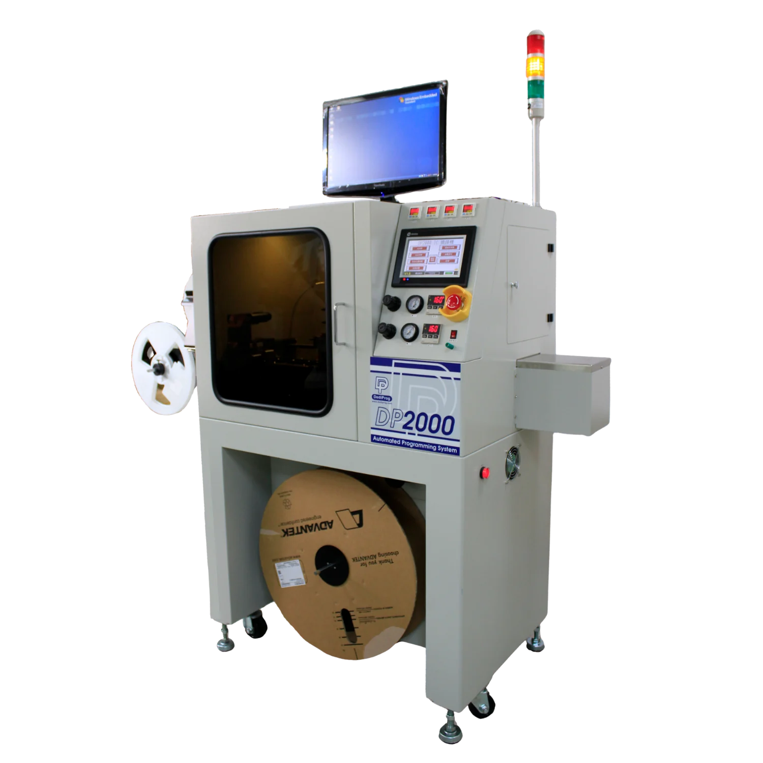 The DP2000 is an advanced automated programming system specifically designed for tube/tape in & tape out operations. Equipped with a moving programming module and 4 synchronized nozzles, the system efficiently handles IC input, positioning, programming, and output.