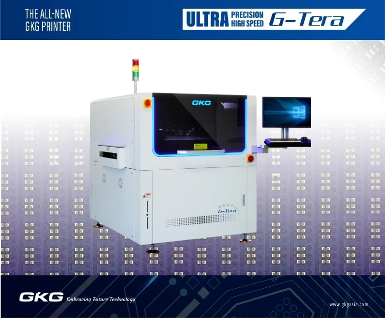 The all-new G-Tera automatic screen printer sets a new standard in SMT printing, equipped with a 3.0-megapixel LIGHT-Bolt CCD camera, an upgraded conveyor system, and an enhanced printing module. Compared to other GKG SMT printers, it can reduce cycle time by up to 40%. With its high-precision servo-driven dynamic system, the G-Tera guarantees fast and accurate alignment. Its independent cleaning system enables printing on ultra-fine pitch pads as small as 0201 metric, ensuring excellent solder paste printing quality and greater production efficiency.