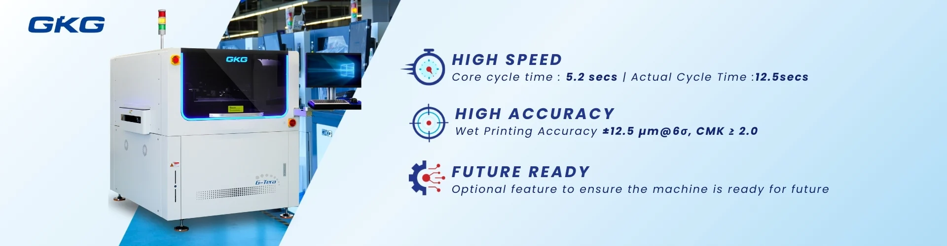 The machine is fully computer-controlled, featuring an intuitive user interface and a wide array of software functions. Designed with future-ready capabilities, the G-Tera is the most advanced and intelligent model in the GKG SMT printer lineup.