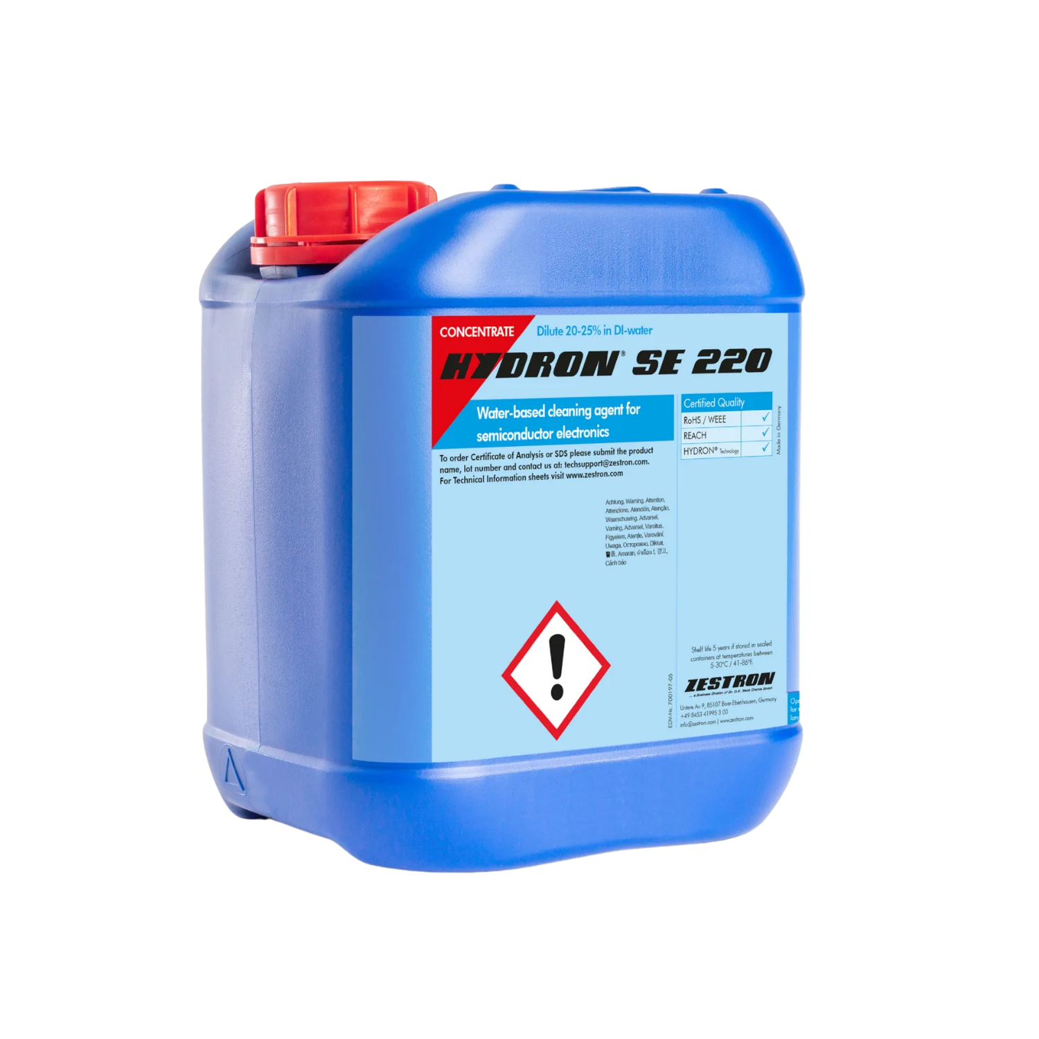 HYDRON SE 220 is a water-based, single-phase, pH-neutral cleaning agent developed specifically for use in dip tank processes. It ensures reliable removal of flux residues from various types of semiconductor electronics, including leadframes, discrete devices, power modules, power LEDs, Flip Chip, and CMOS, for example after die attach.