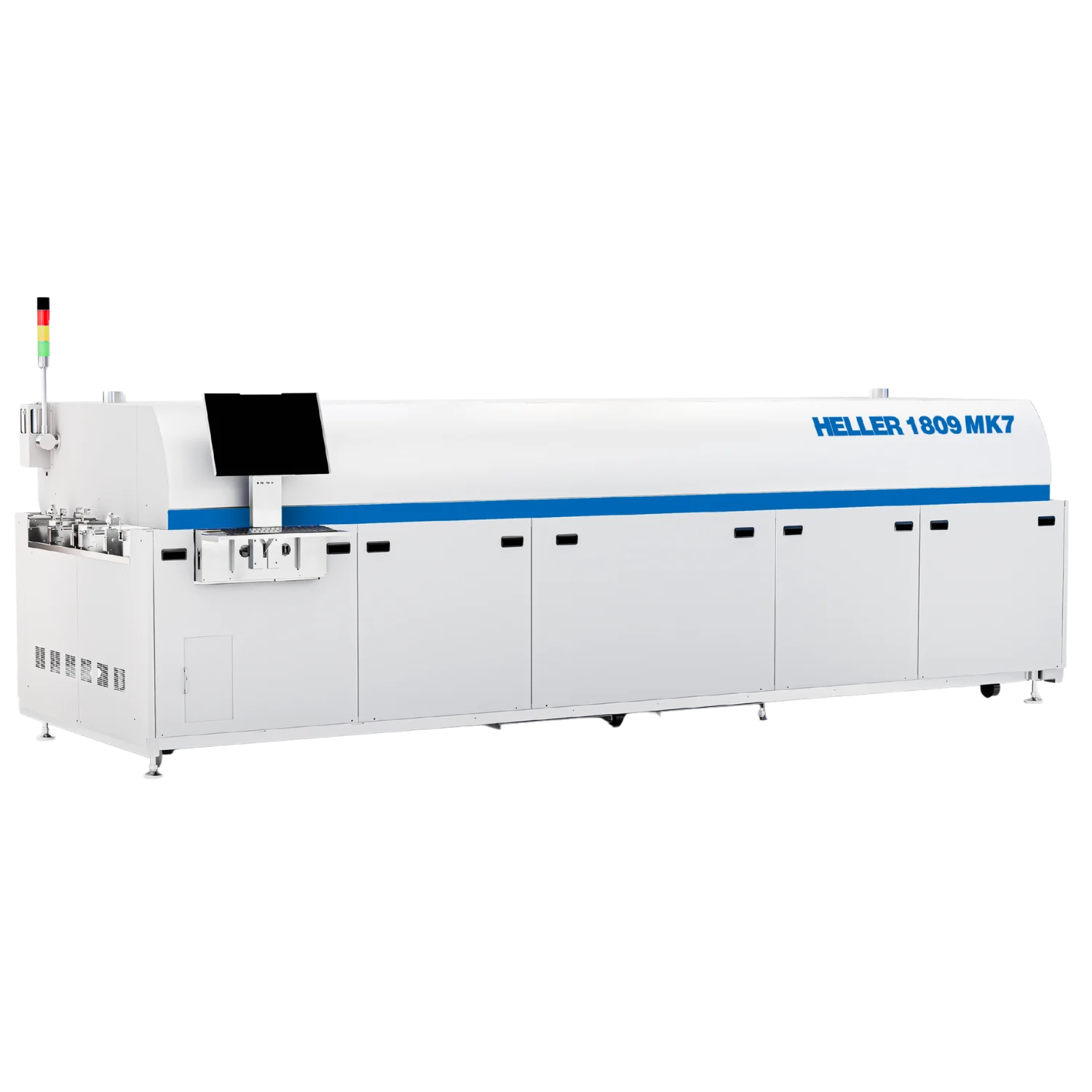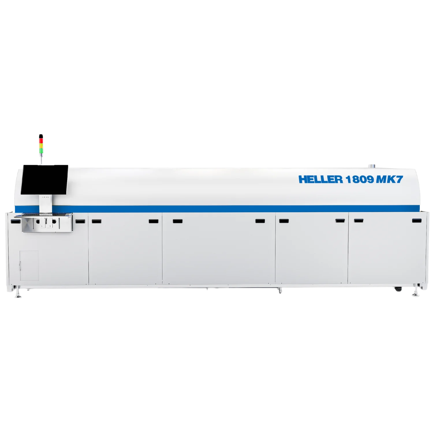 The ISO-certified Heller MK7 reflow oven is an advanced reflow system designed with several groundbreaking engineering concepts. The system integrates multiple customer-driven requirements, including lower Delta T on the board, reduced nitrogen consumption, and extended product maintenance intervals, all within a low-height design that allows clear visibility across the production floor.