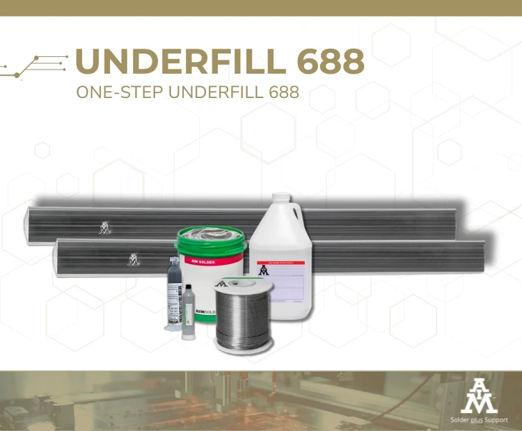 One-Step Underfill 688 wets solder to OSP, ENIG, immersion silver, and immersion tin board surfaces and does not require flux. It is compatible with AIM’s full line of no clean flux chemistries.