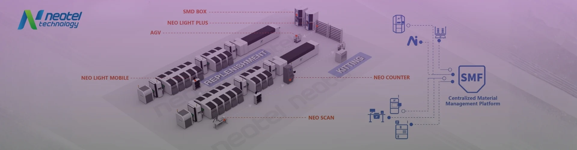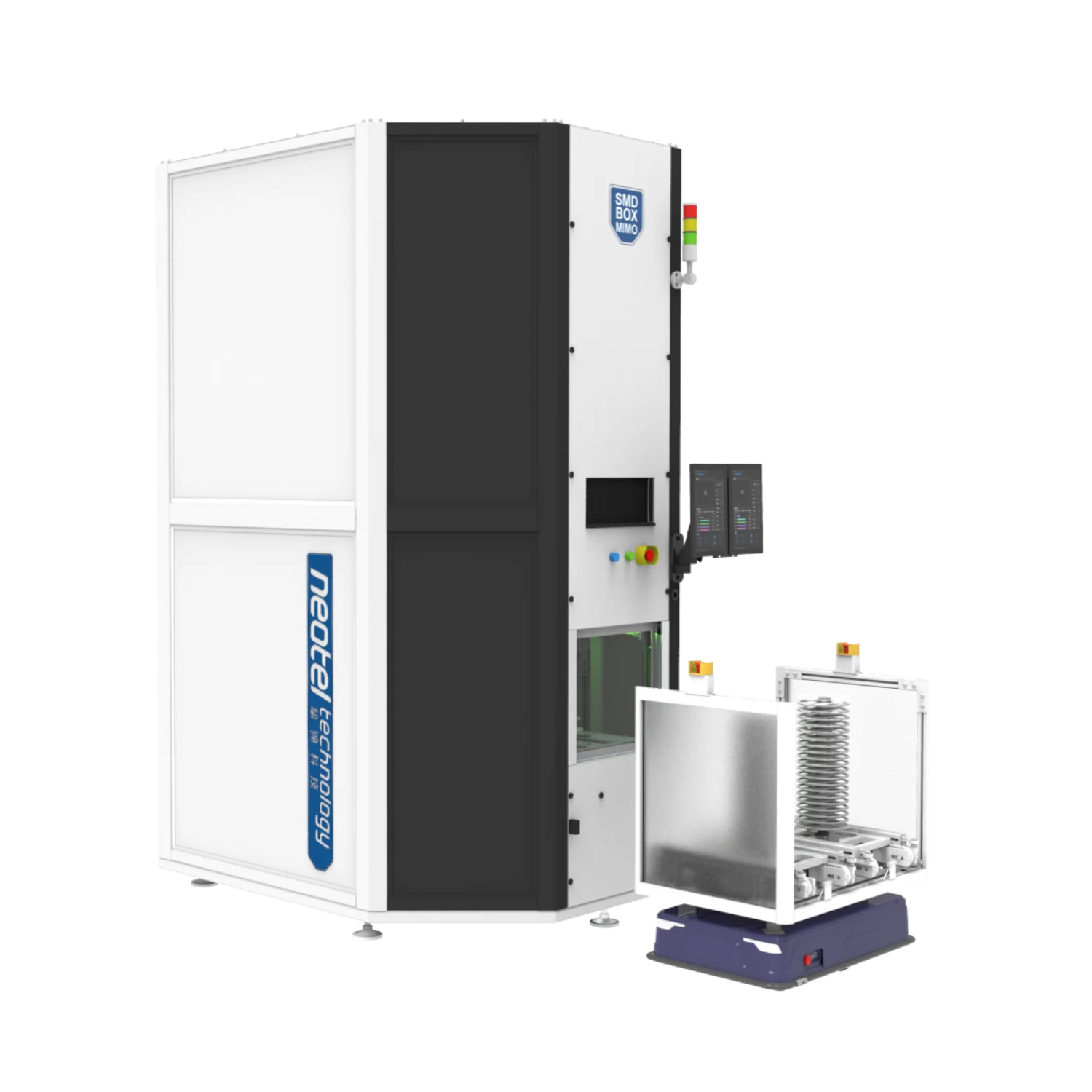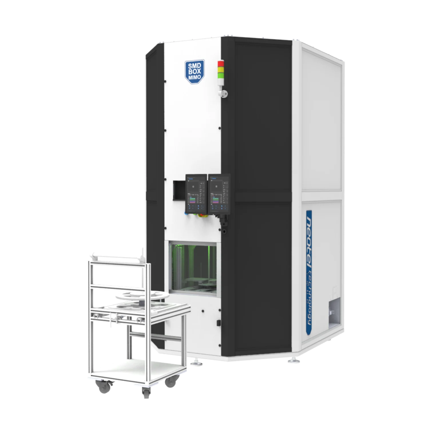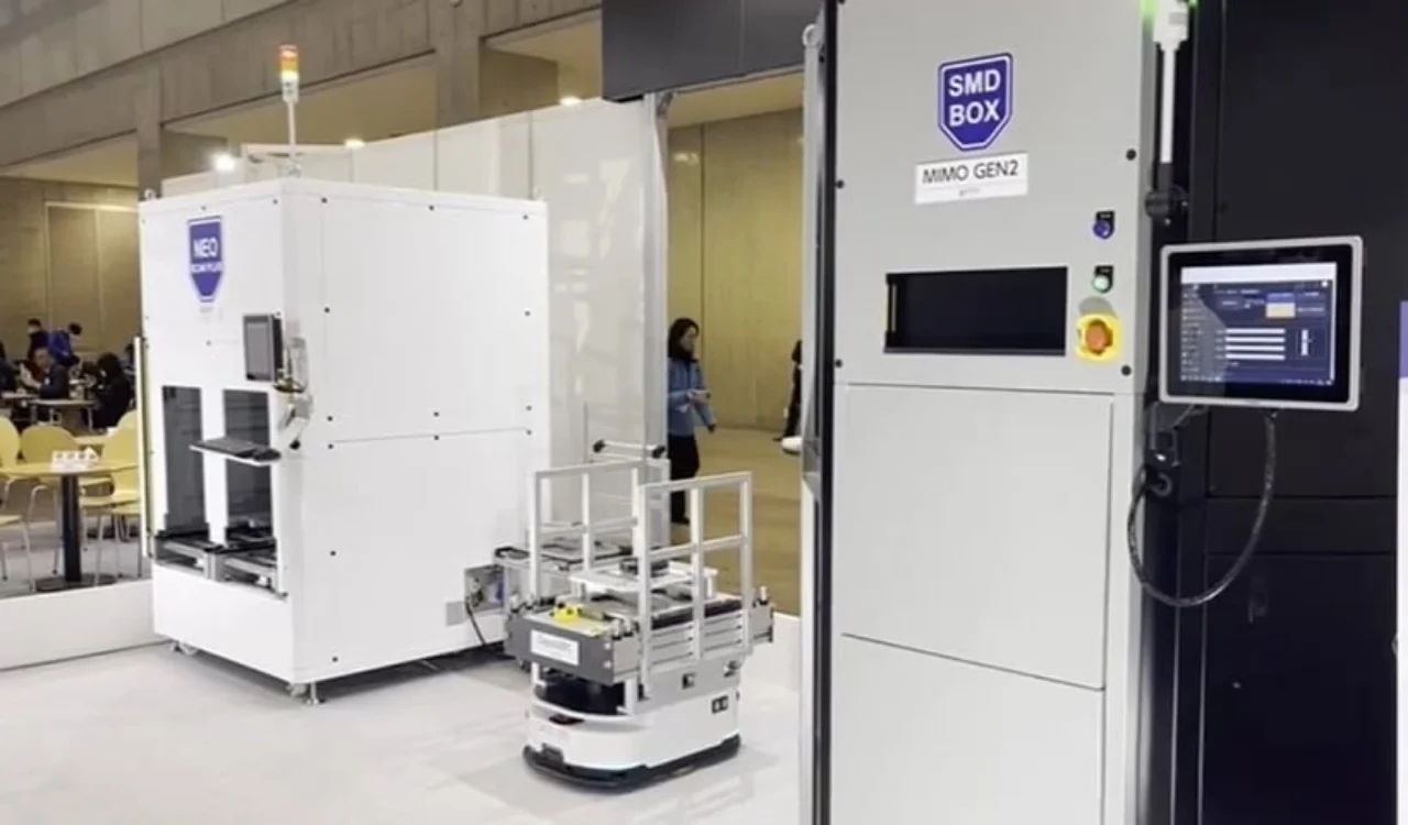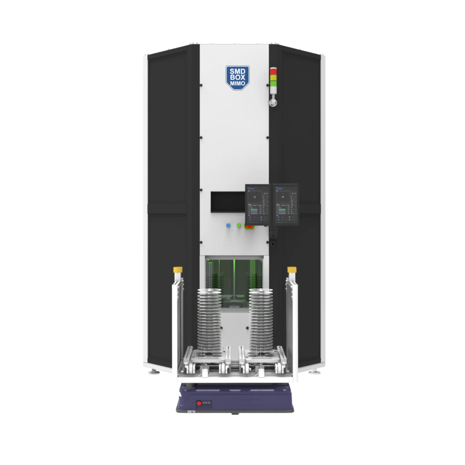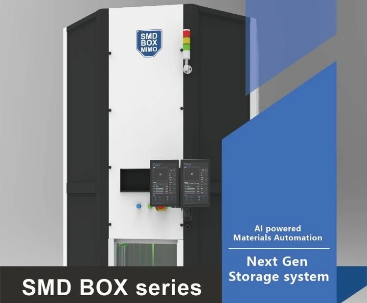 Innovative batch processing storage system enhancing SMT production performance. Manage multiple reels at once with AGV or trolley loading, automated kitting, and smooth MES integration – efficiently controlled by intelligent SMF software.