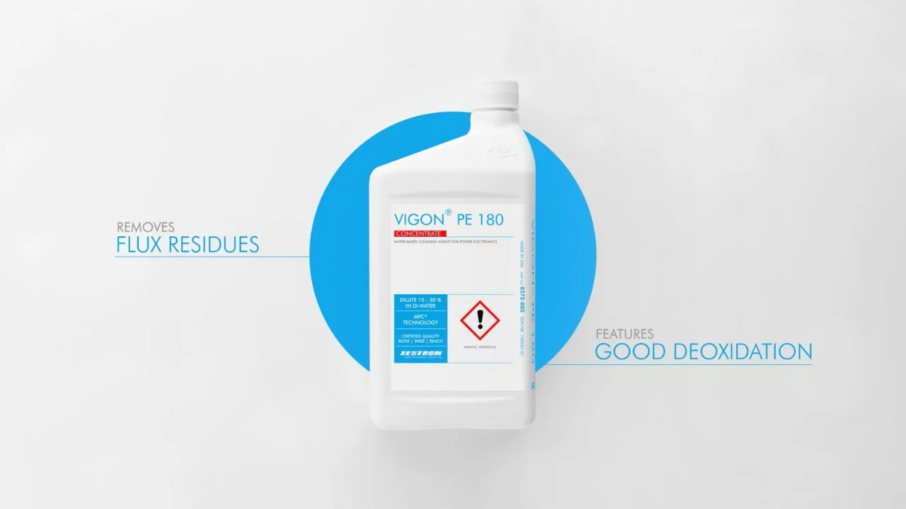 VIGON PE 180 is a water-based, pH-neutral cleaning agent developed for the defluxing and deoxidation of copper surfaces in Power Electronics and PCBAs when used in spray-in-air equipment.