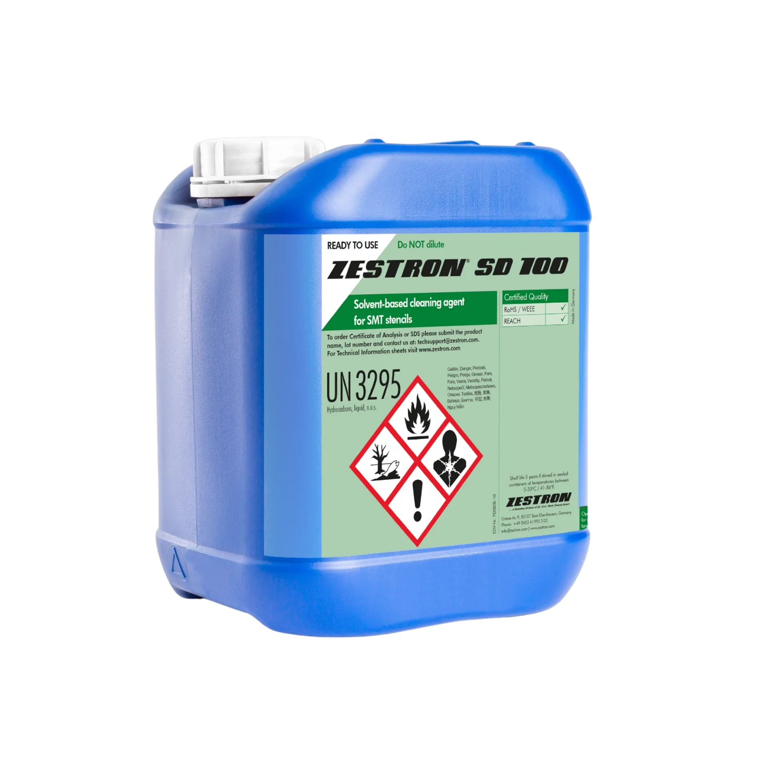 Solvent-based cleaning agent developed to remove solder paste from SMT stencils in spray-in-air equipment. Depending on the type of fluxes, misprinted assemblies can also be cleaned with ZESTRON SD 100. The product is furthermore recommended for stencil underside wiping in printers or manual stencil cleaning.
