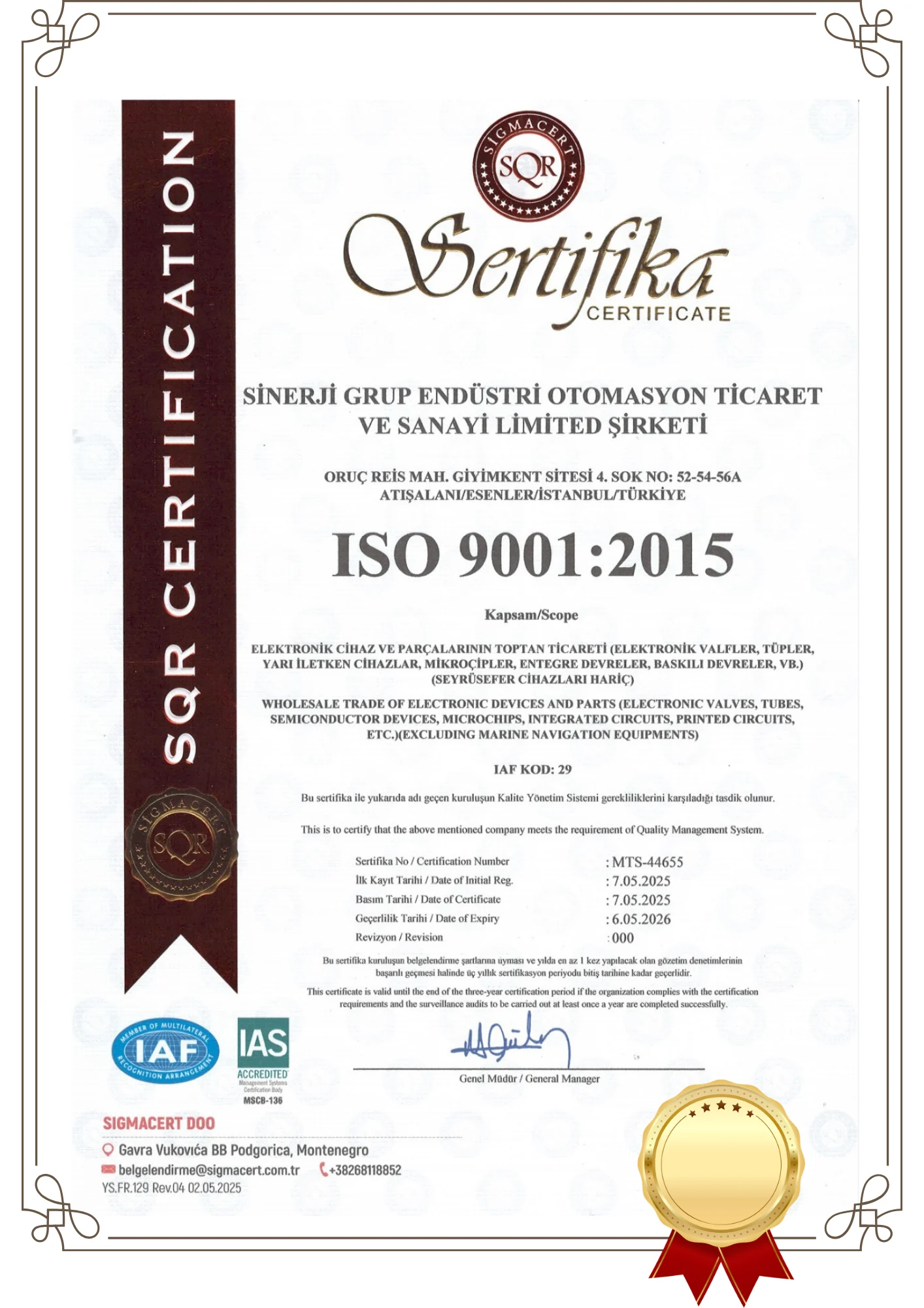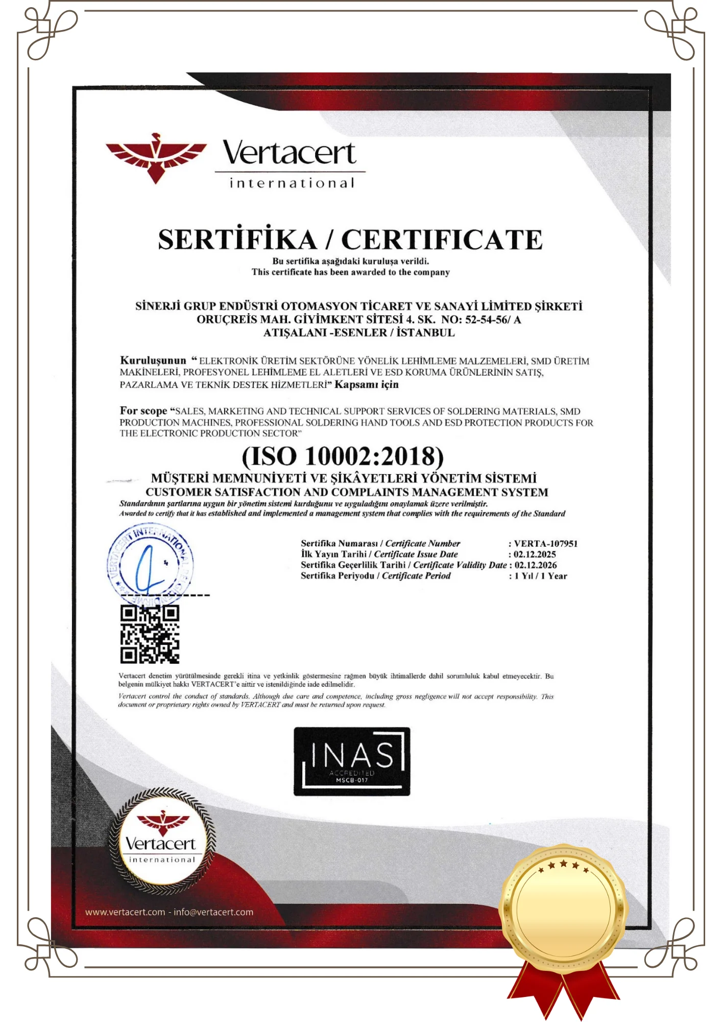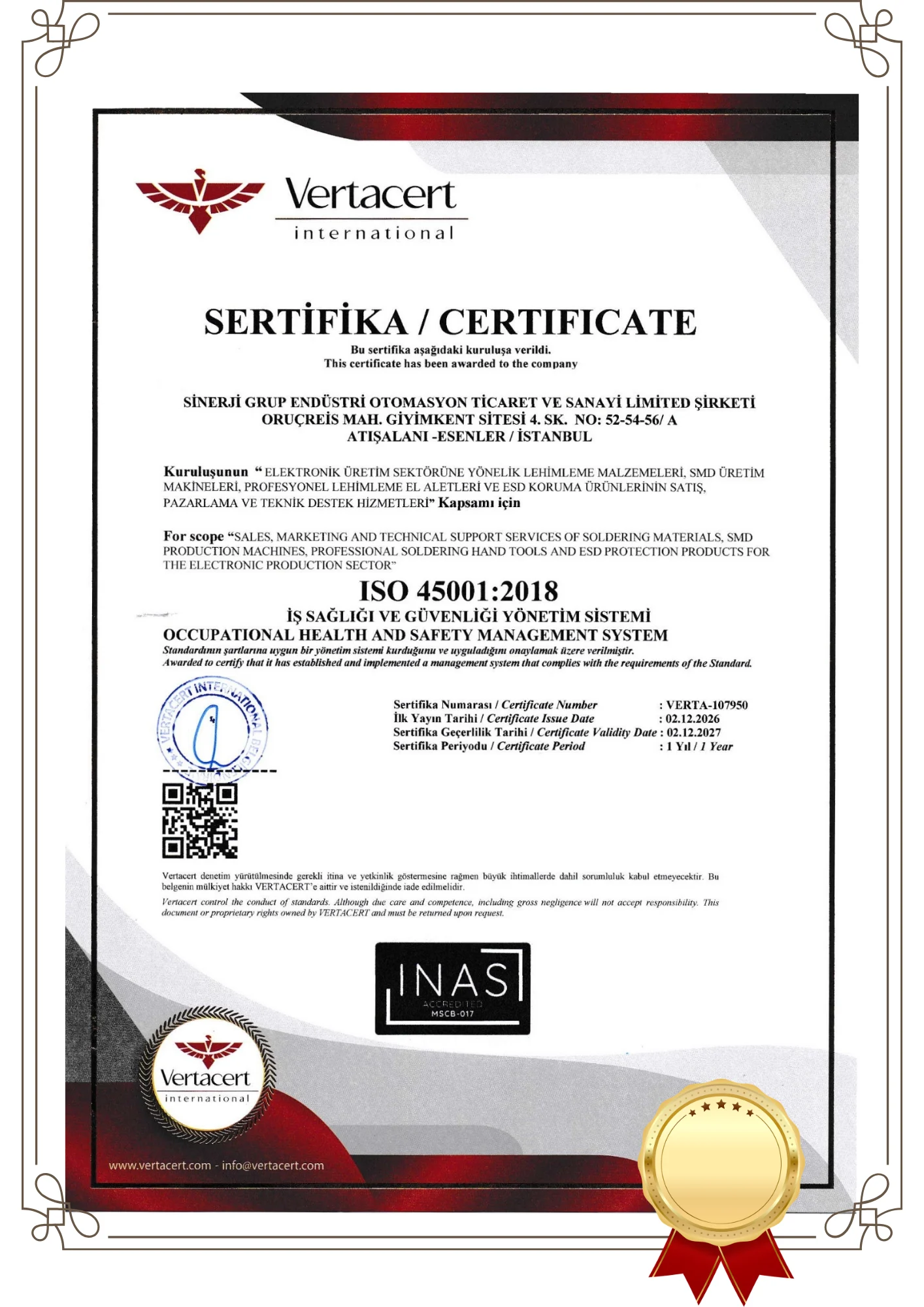 Sahip olduğumuz uluslararası sertifikalar, tüm operasyonlarımızın kalite, güvenlik ve sürdürülebilirlik kriterlerine uygun şekilde yönetildiğini belgeleyen güçlü bir göstergedir.