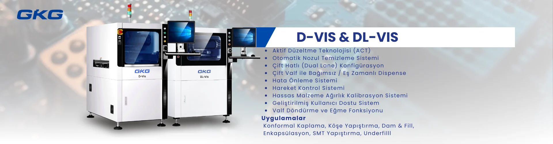 D Serisi Makine, hassas hacim kontrolü ve konum doğruluğu ile öne çıkarak, ayrı noktalar halinde sıvı uygulamayı kolayca gerçekleştirir. Dar alanlarda veya bileşenlerin yakınında çok ince çizgilerle sınırları aşmadan çalışabilir. Temassız dağıtım teknolojisi sayesinde, geleneksel dispenserlerde görülen sorunlar tamamen ortadan kaldırılır.