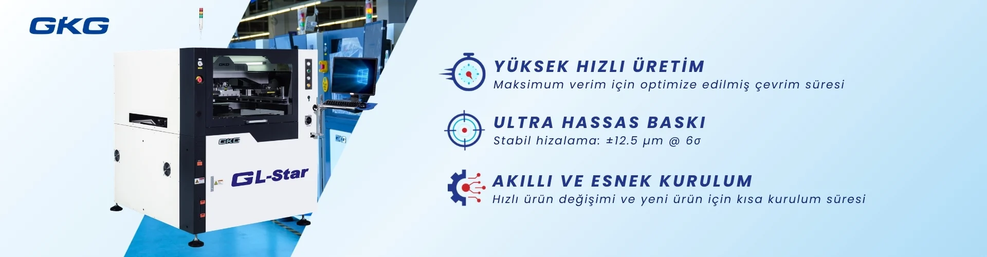 Bilgisayar kontrollü sistem; baskı yüksekliği, rakle basıncı ve temizleme döngüleri gibi parametrelerin tek tıkla kolayca ayarlanmasına imkan tanır. Otomatik stencil konumlandırma, otomatik üst kıskaçlar ve motorlu yan kıskaçlar ile donatılmış GL-Star, minimum operatör müdahalesiyle üstün baskı kalitesi ve maksimum stabilite sunar.