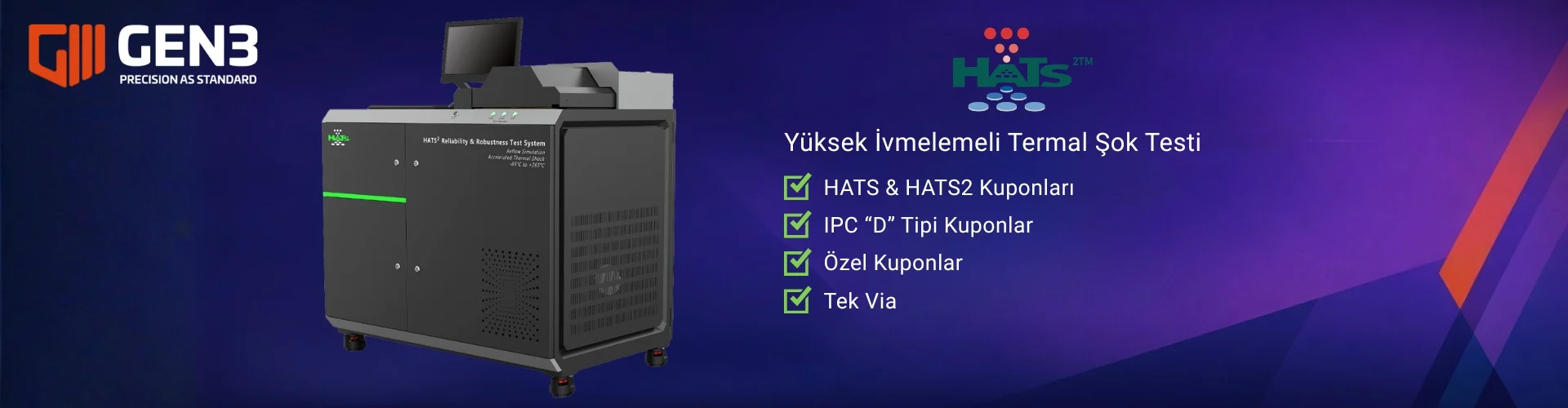 HATS²™ (Highly Accelerated Thermal Shock) 2 Test Sistemi, konveksiyon reflow montaj simülasyonu ile PCB ve substrat via yapıları ve PTH’lerin güvenilirlik ve sağlamlık değerlendirilmesi amacıyla tasarlanmıştır. Bu gelişmiş sistem, konveksiyon reflow montaj süreçlerinin hassas şekilde simüle edilmesini sağlarken kritik ara bağlantıların yapısal sağlamlığını değerlendirir.